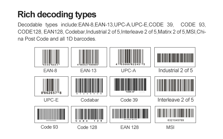 UPC-A,UPC-E,EAN-13,EAN-8, Codabar, Code 39, Code 39 Full ASCll,China Post,Plessey, MSl, Code 93, Code 128, Industrial 2 of 5,Interleave 2 of 5, Matrix 2 of 5, Code 11,ISBN, SSN,Code 32(ltalian pharm code), Code 39 extended, GS1-128 and ITF-14,SISAS,GS1 Omnidirectional, GS1 Limited, Aviation25, RSS 14. |